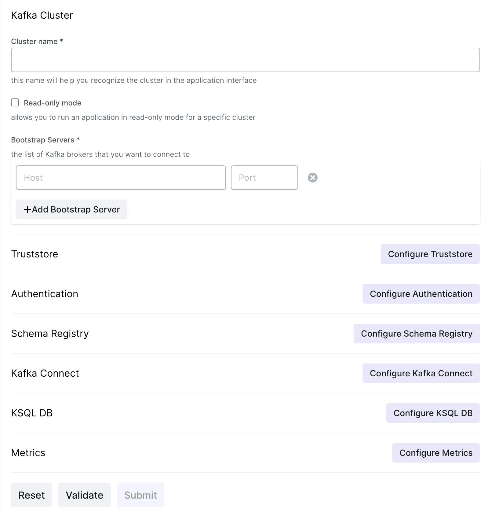 During the configuration process, you can also upload configuration-related files (like truststore and keystores). They will be stored in etc/kafkaui/uploads a folder with a unique timestamp suffix to prevent name collision. In the wizard, you can also use files that were mounted to the container's filesystem, without uploading them directly.